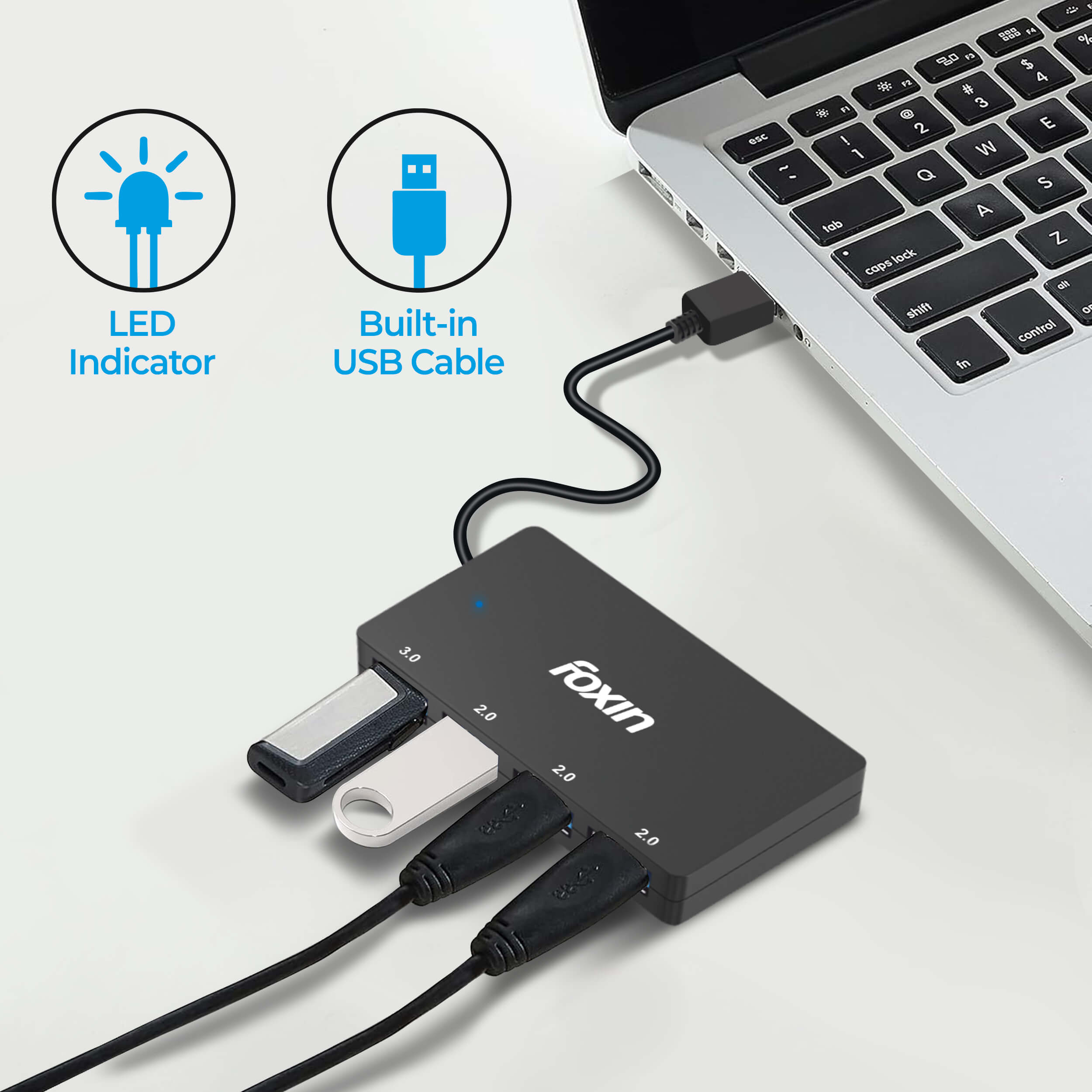 The Foxin USB hub 3.0 is built with a sleek and lightweight design for ultimate portability. The built-in USB 3.0 cable ensures stable performance and clutter-free setup, while the LED indicator shows active status. With 1 USB 3.0 and 3 USB 2.0 ports, this multiport adapter makes multitasking effortless—whether at your desk or on the move.