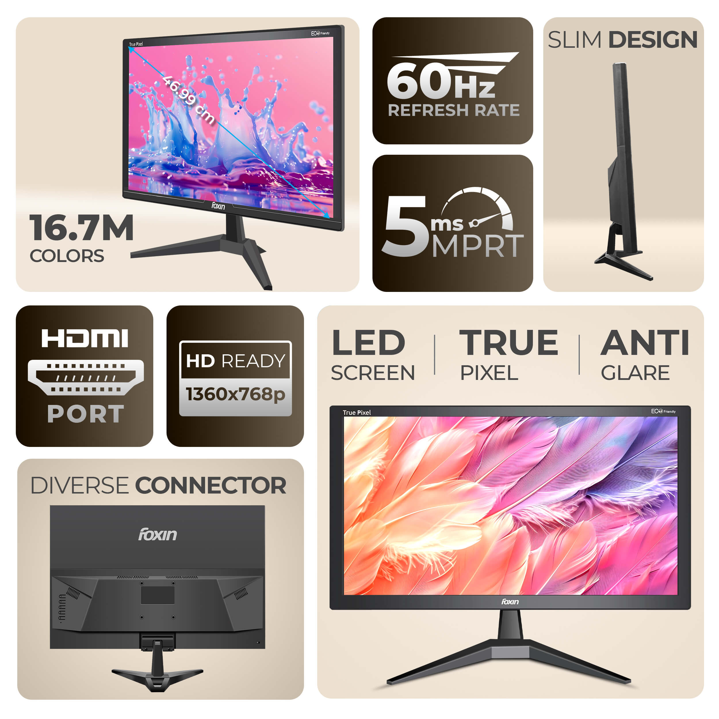 • Crystal-Clear True Pixel Display: 19” flat LED monitor with HD 1366x768p resolution, 16.7M colors, and sharp color calibration for everyday use.
