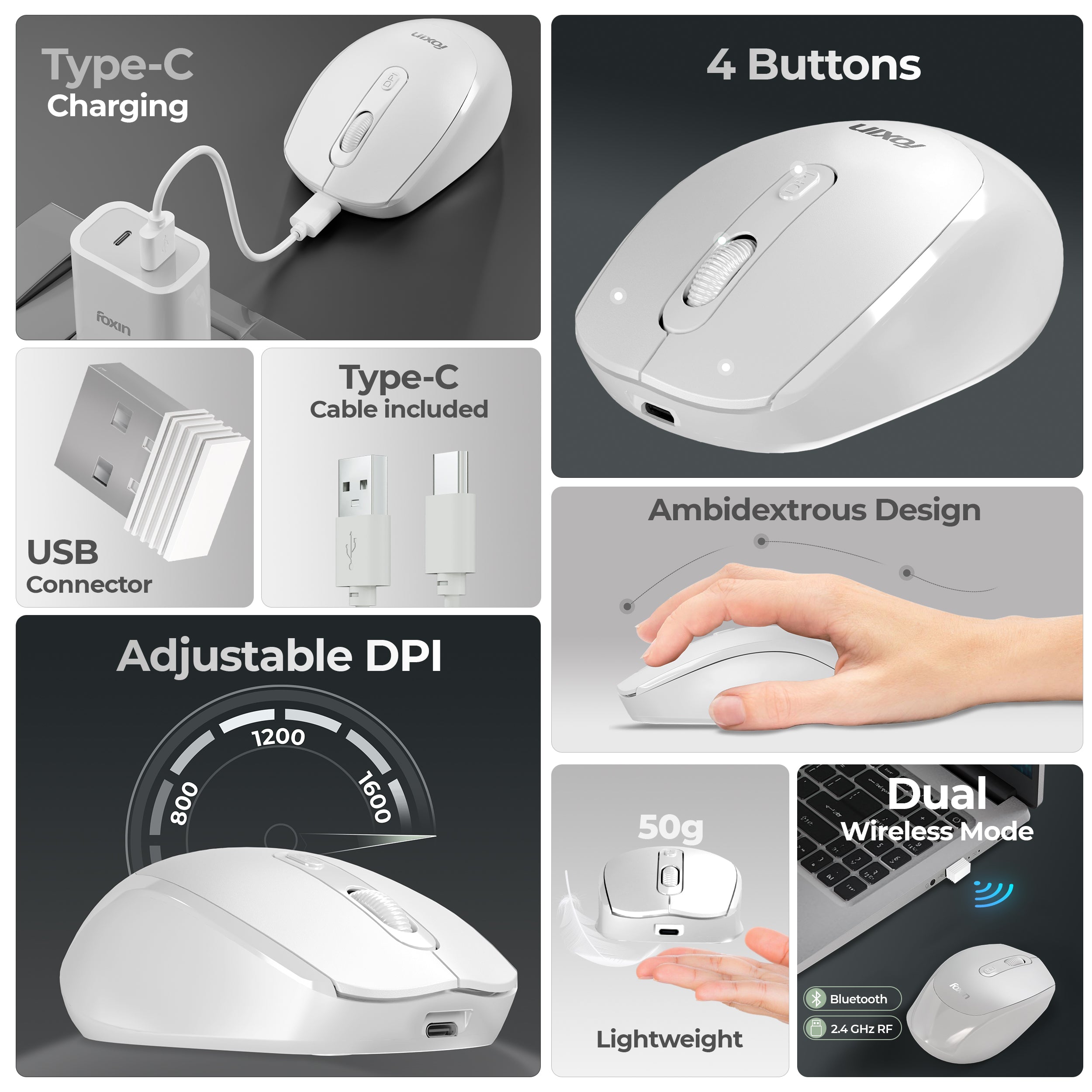 No more disposable batteries! The Foxin FLOW features a rechargeable 500mAh battery and Type-C fast charging cable included in the box. Connect effortlessly via Bluetooth 5.0 or 2.4 GHz RF for stable, lag-free performance.