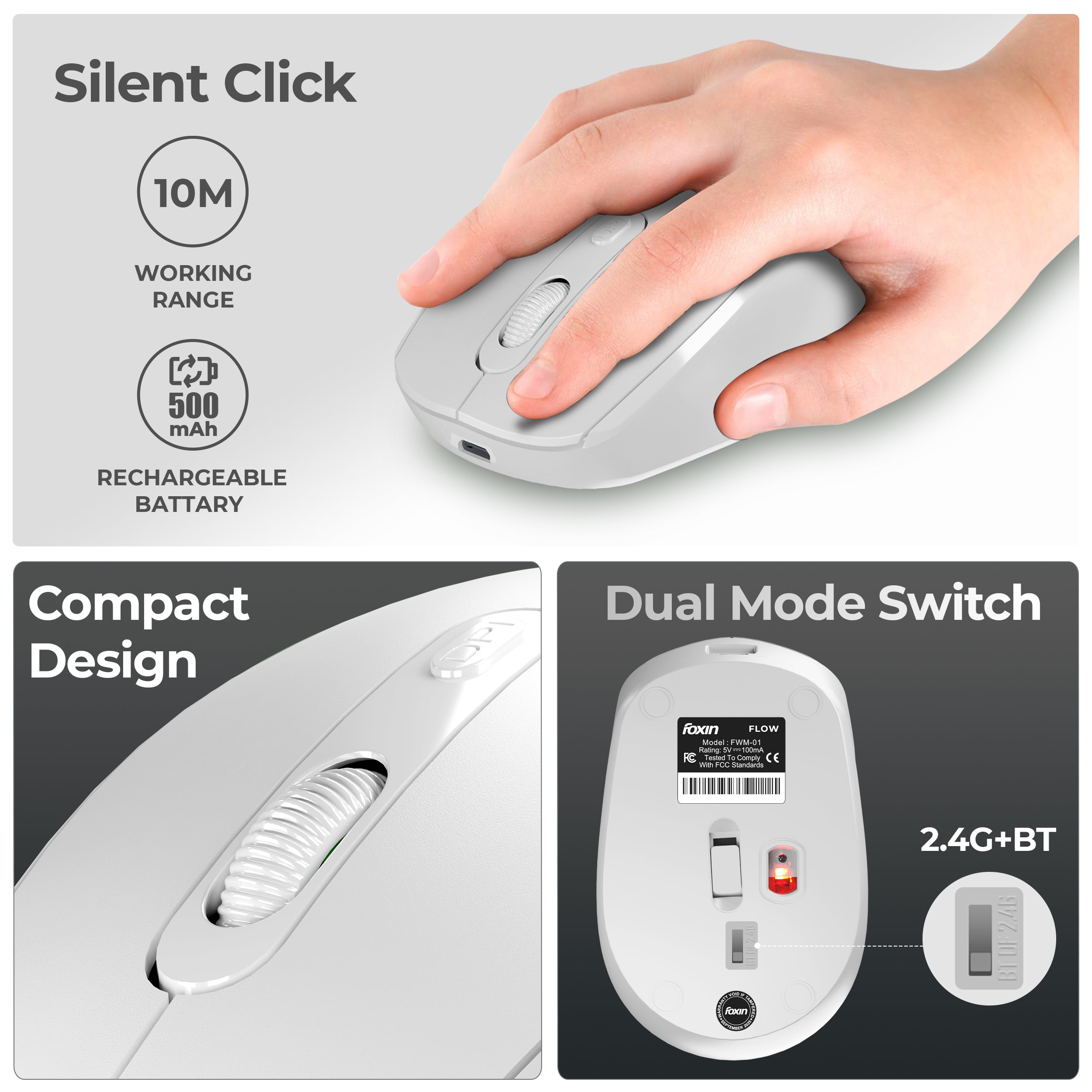 Experience smooth, uninterrupted control with the Foxin FLOW Wireless Mouse - built for comfort, speed, and reliability. With dual connectivity (Bluetooth 5.0 + 2.4GHz RF), an in-built rechargeable battery, and Type-C fast charging, it’s the perfect choice for laptop, PC, or MacBook users.