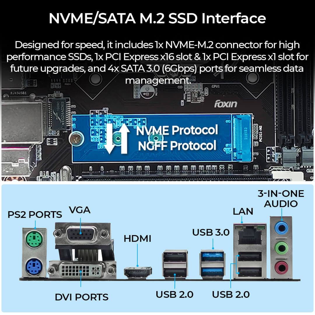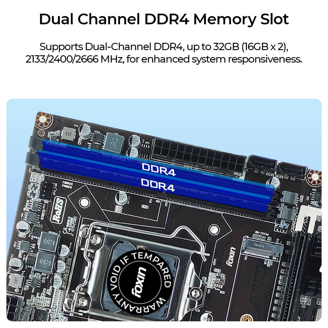 The Foxin FMB-H310 PRIME motherboard features an LGA 1151 motherboard socket with an H310 chipset, ensuring smooth and stable performance.