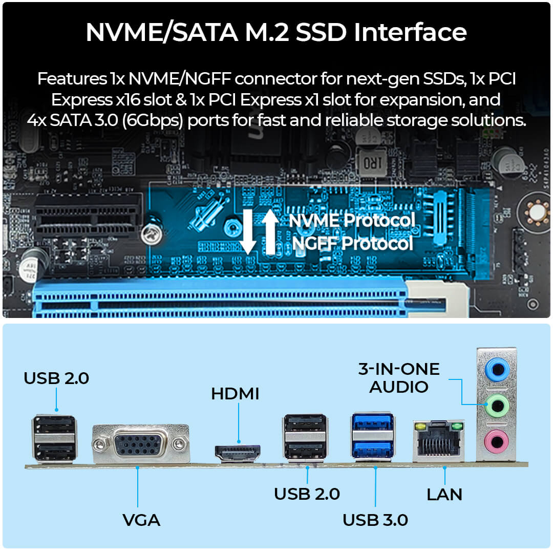 Equipped with an NVME port and 4x SATA 3.0 ports, offering faster storage and data transfer.