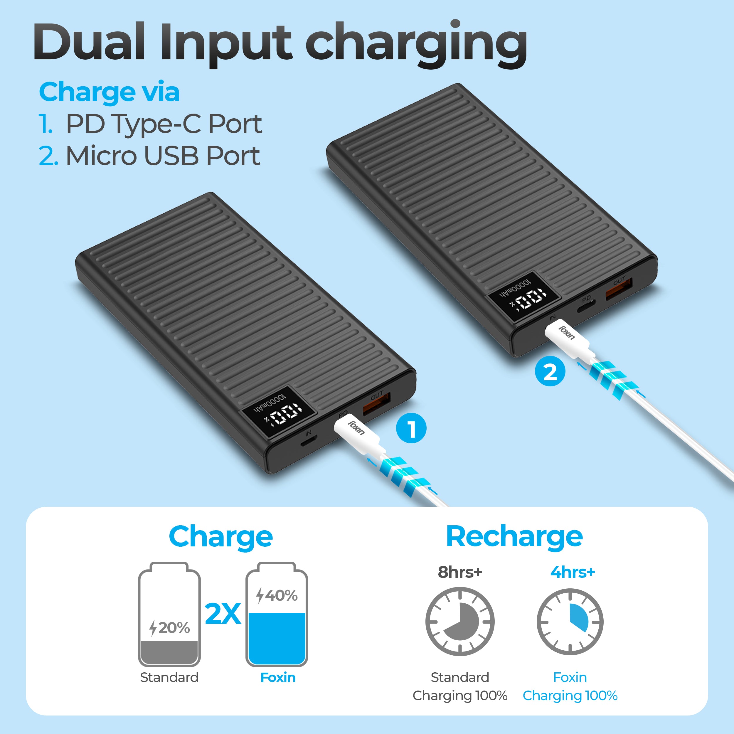 22.5W Rapid/Fast Charging: Experience lightning-fast charging with Foxin's power bank, delivering up to 22.5W through QC+PD charging ports for efficient power replenishment.