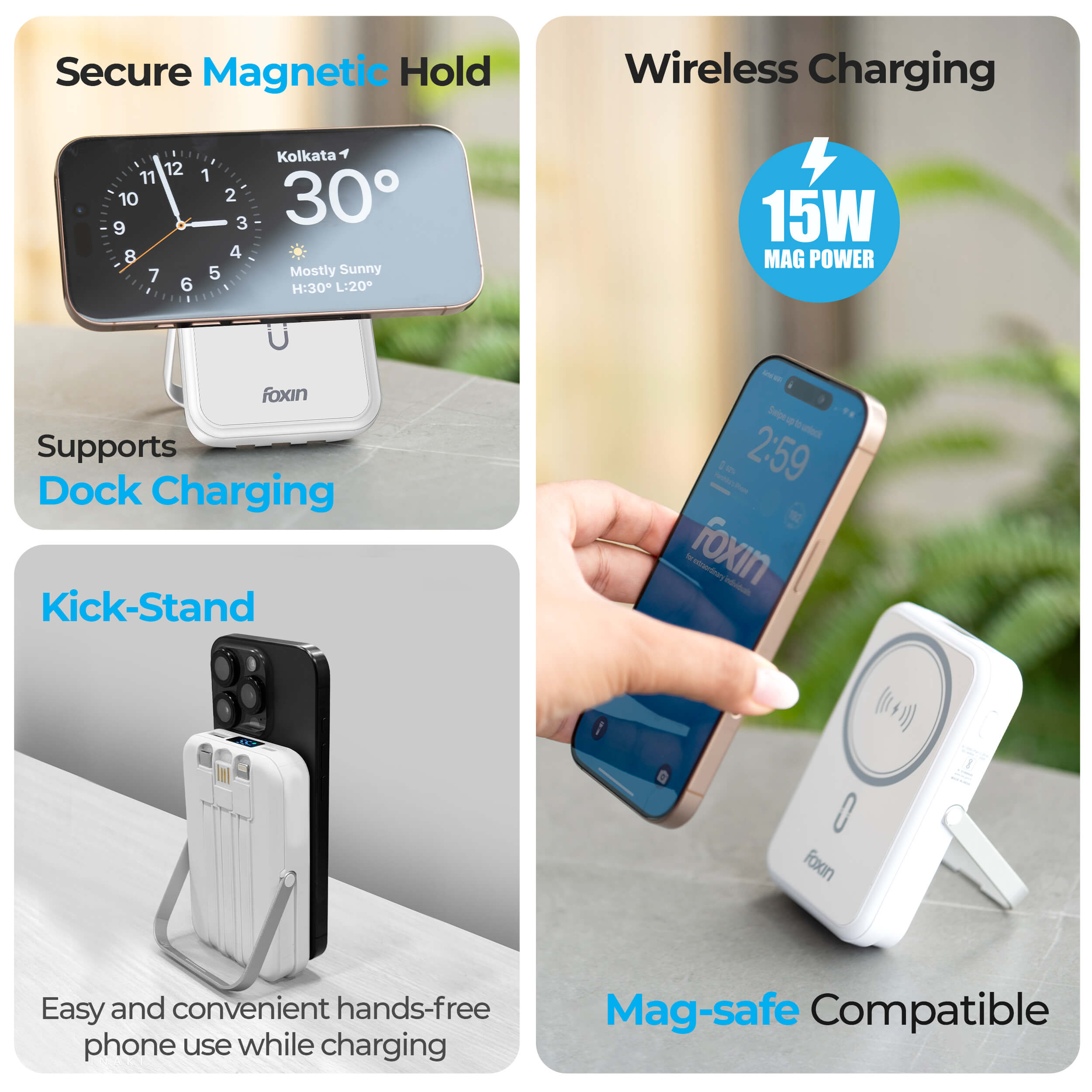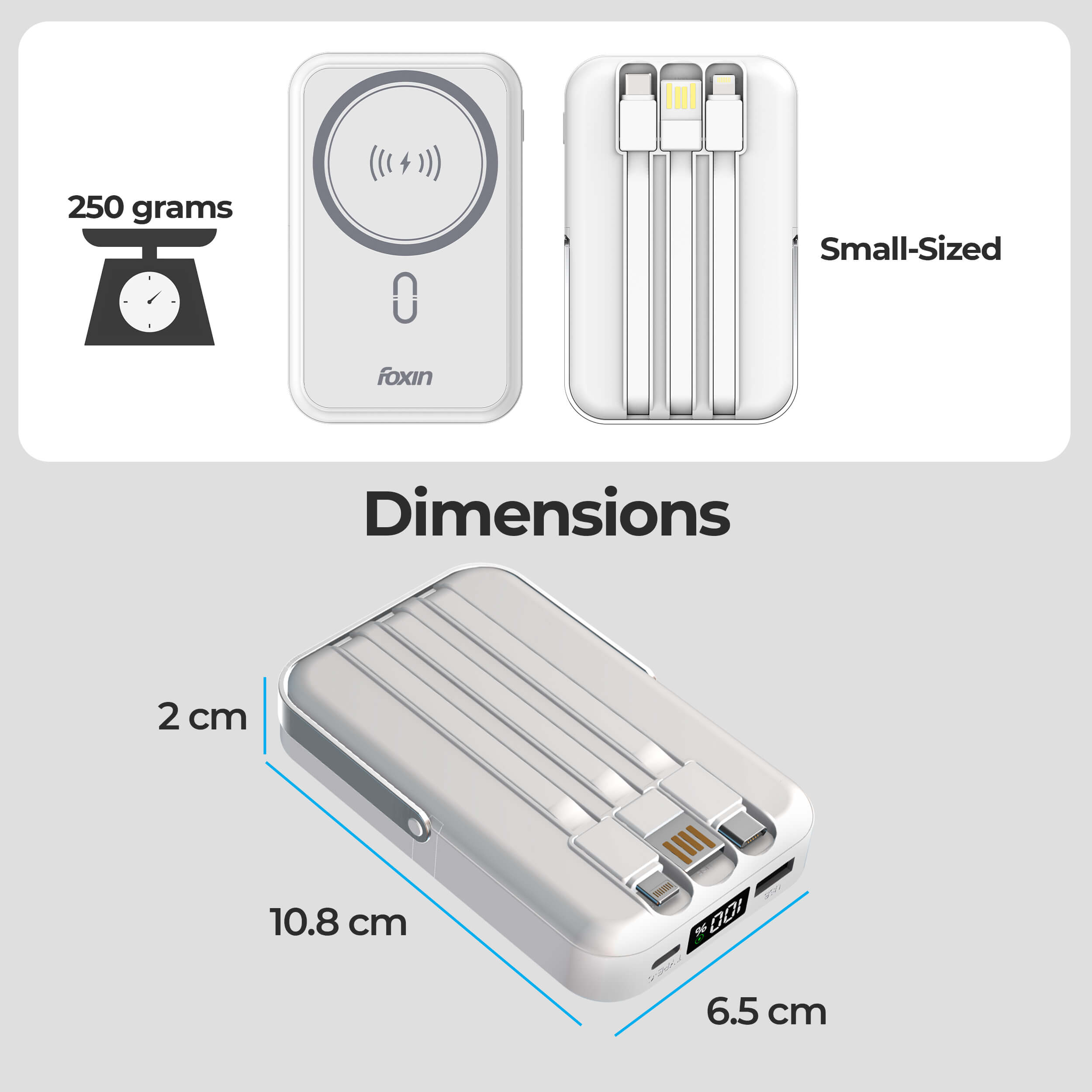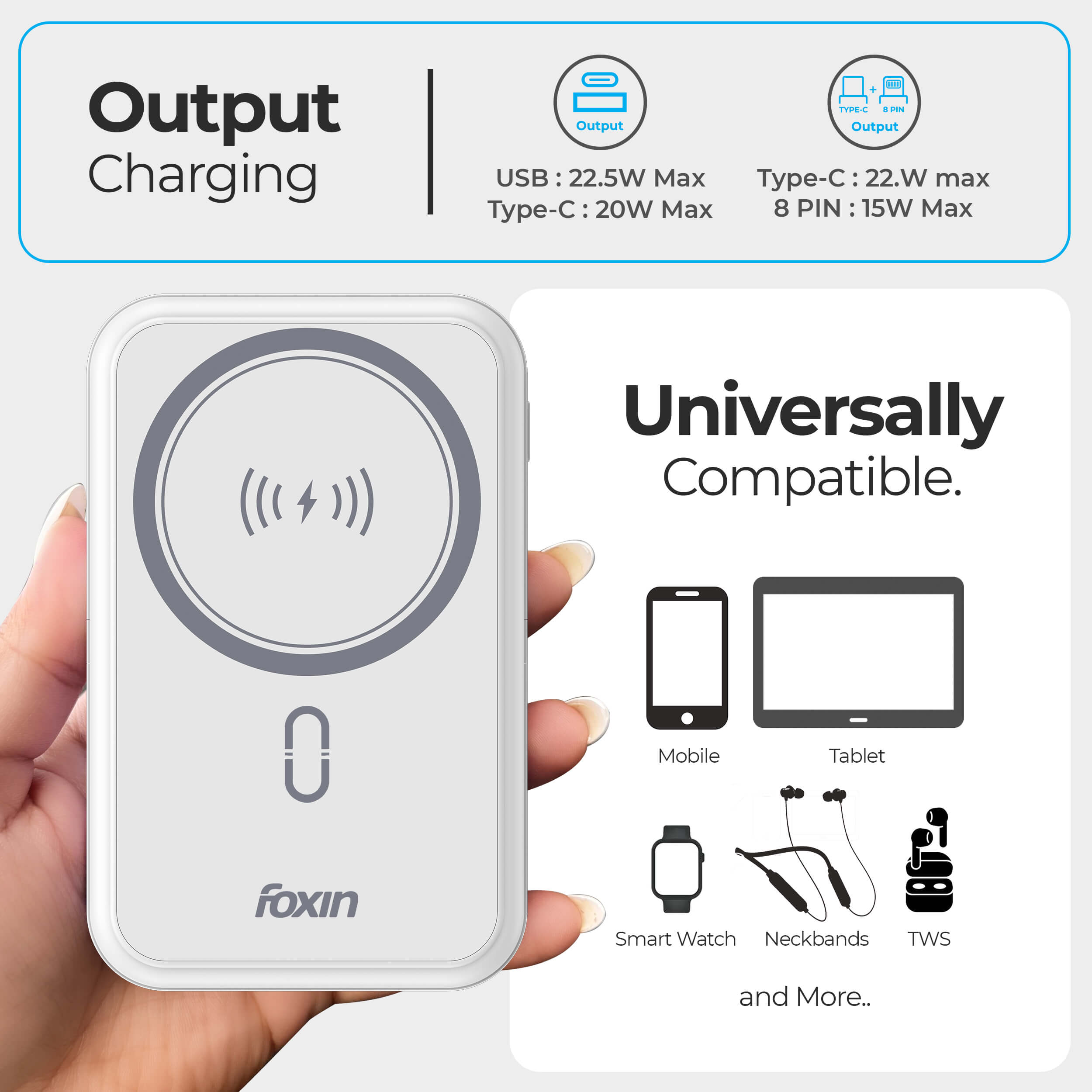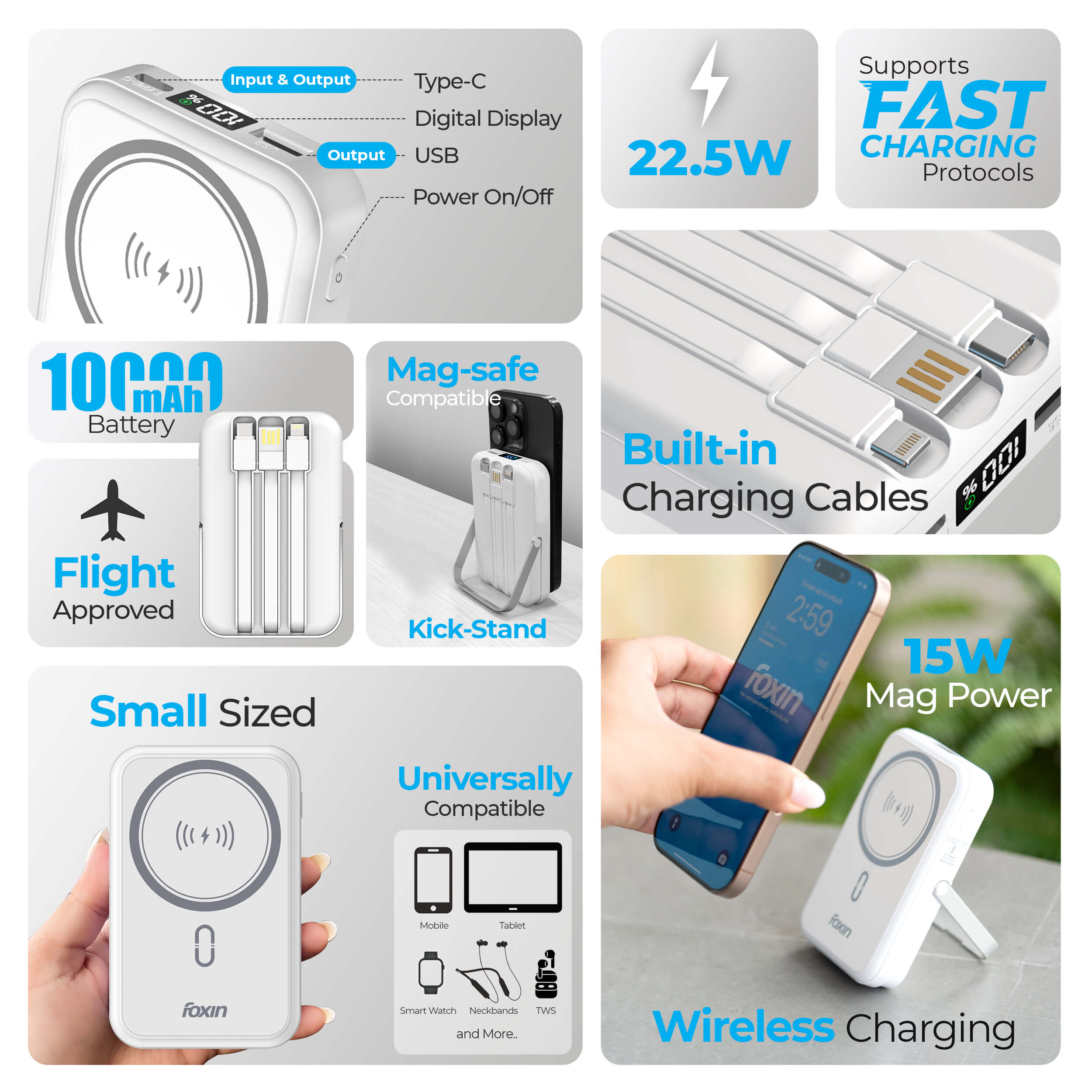 • 🔋 22.5W Fast Charging with 10000mAh Power: Foxin All-in-One Mag Pro delivers powerful 22.5W QC + PD wired charging and 15W wireless fast charging—ideal for on-the-go users needing reliable speed and performance.