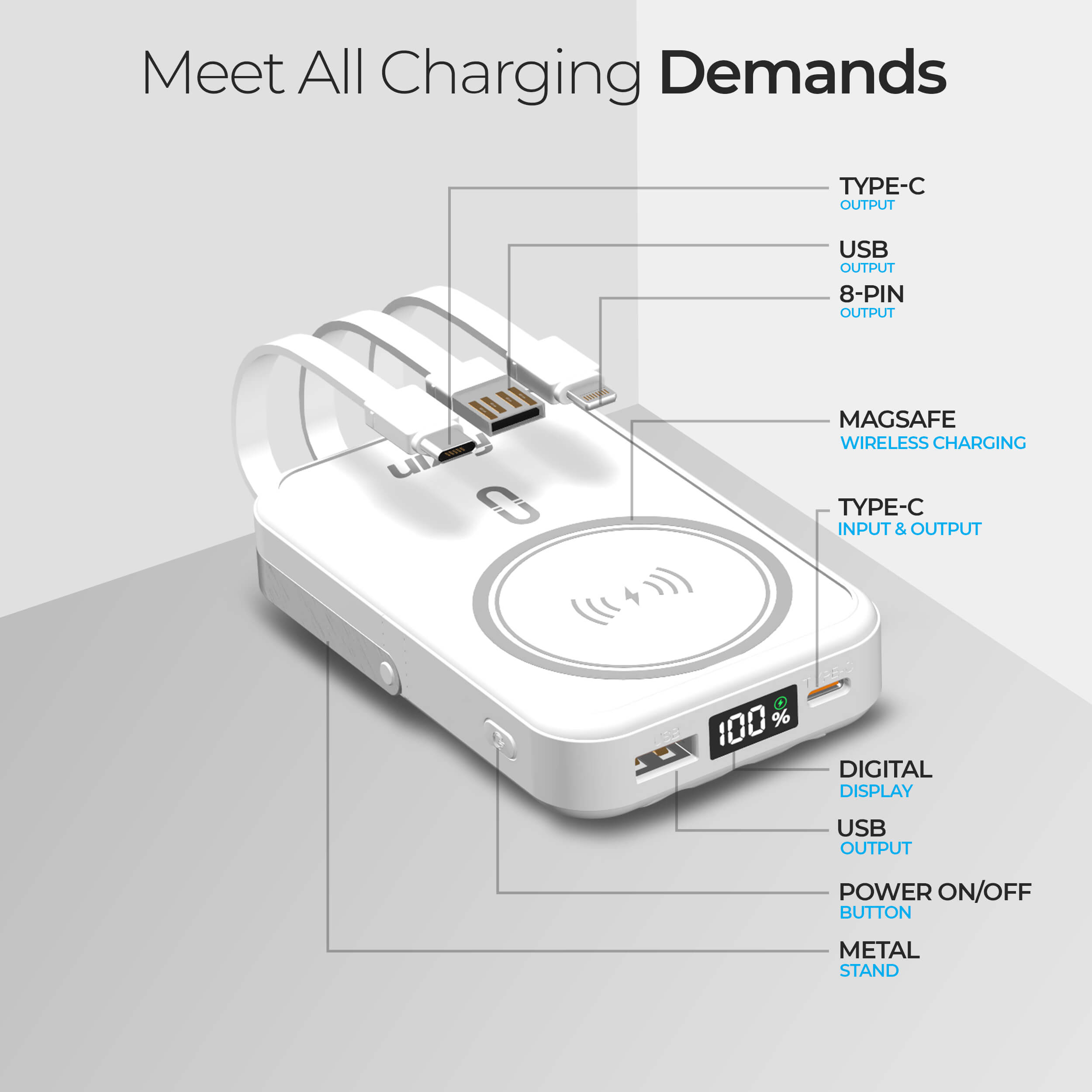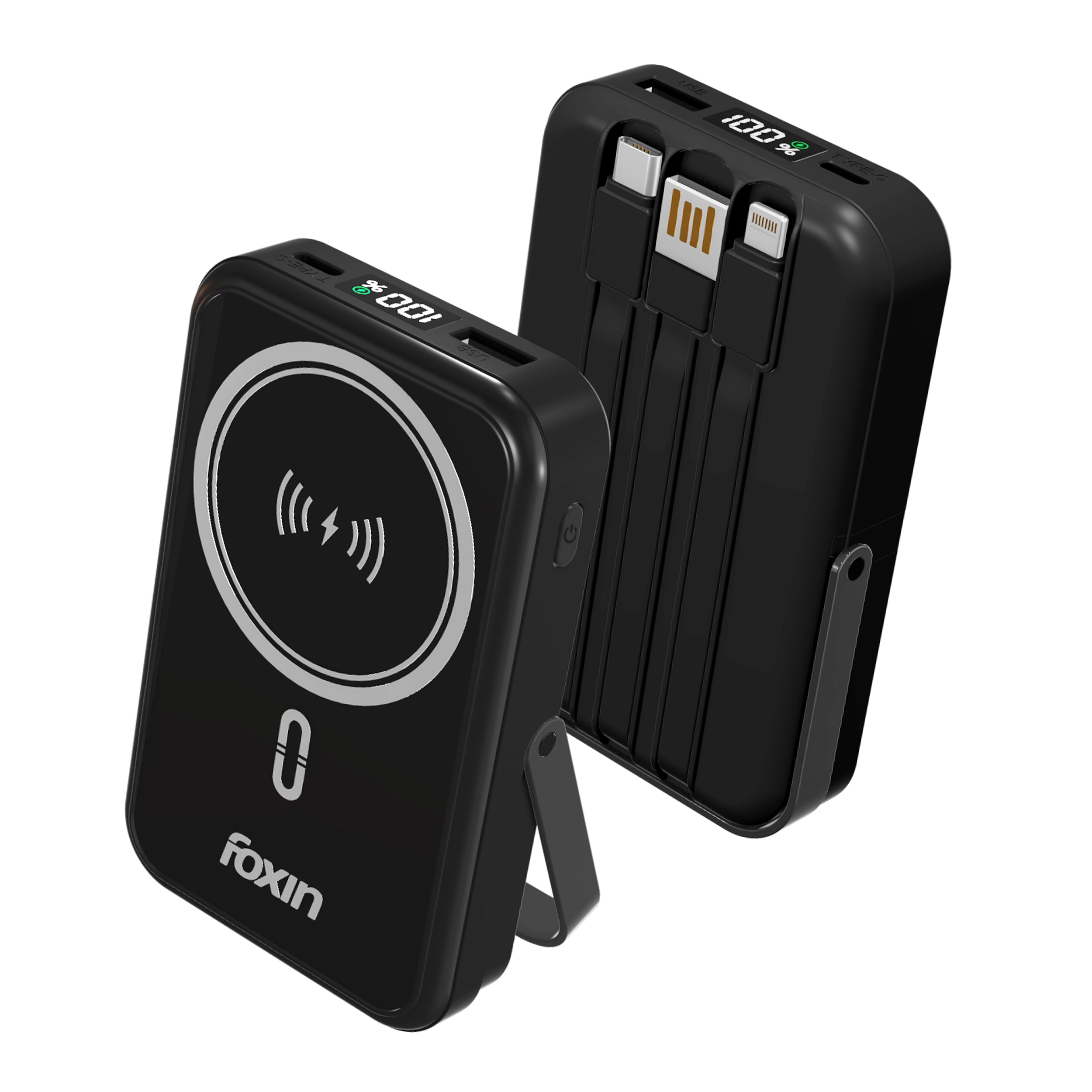 No more tangled cords—Foxin Mag Pro comes with built-in USB, Type-C, and Lightning (8-pin) cables for seamless charging and recharging. Whether it’s your iPhone 15, Android phone, or any Qi-compatible device, this wireless power bank handles them all with ease.