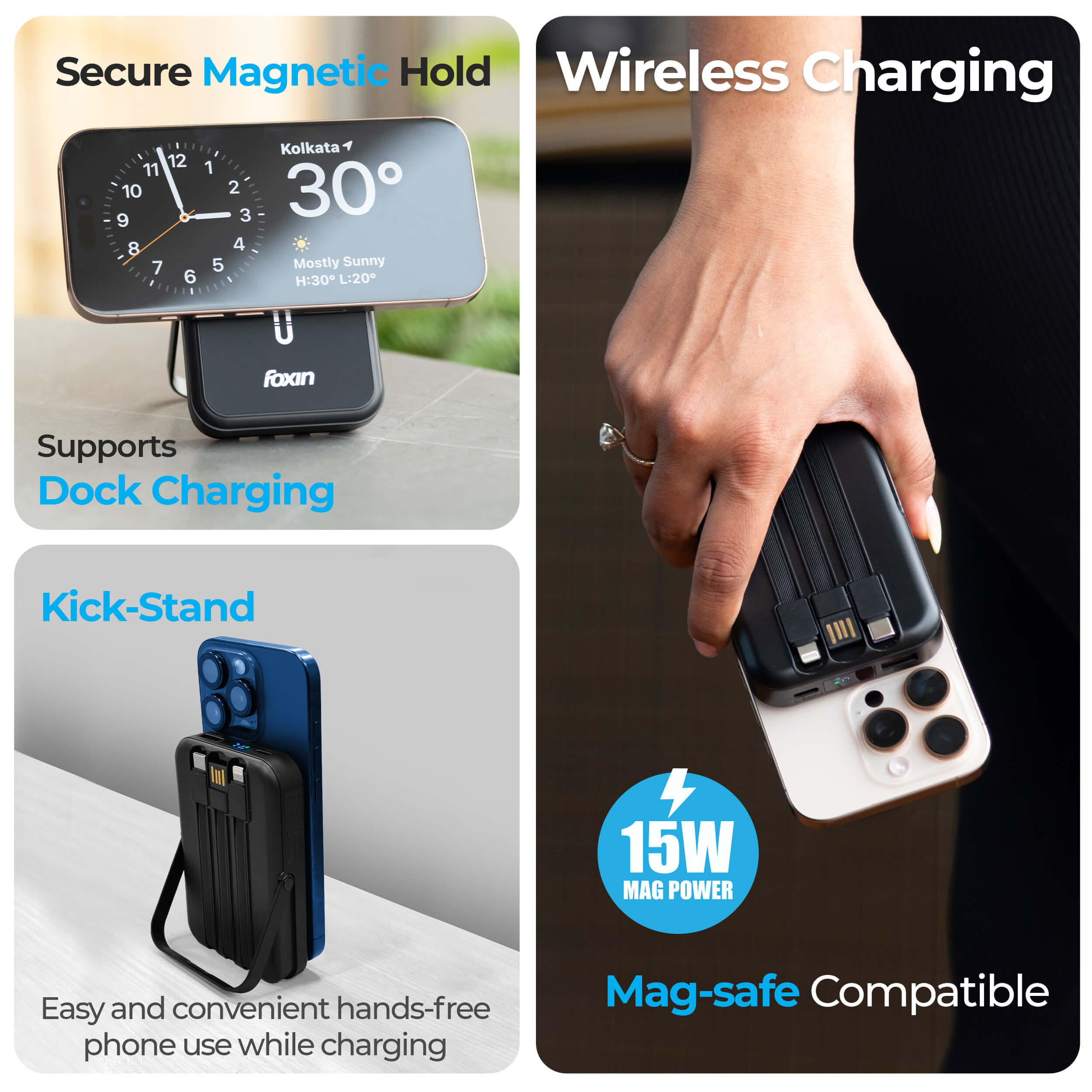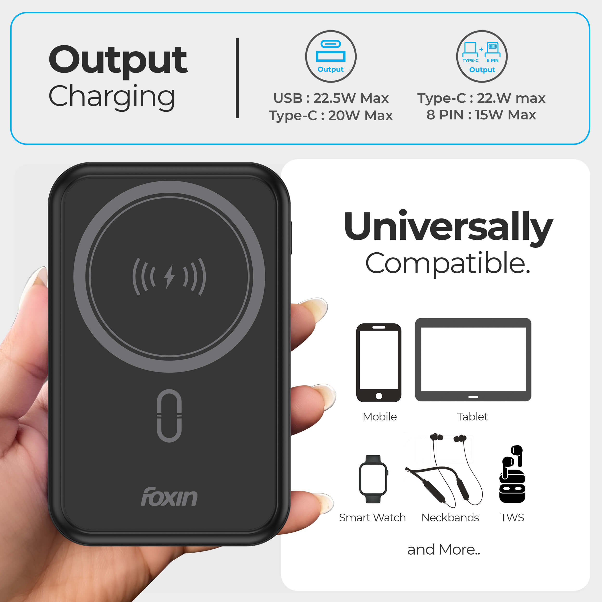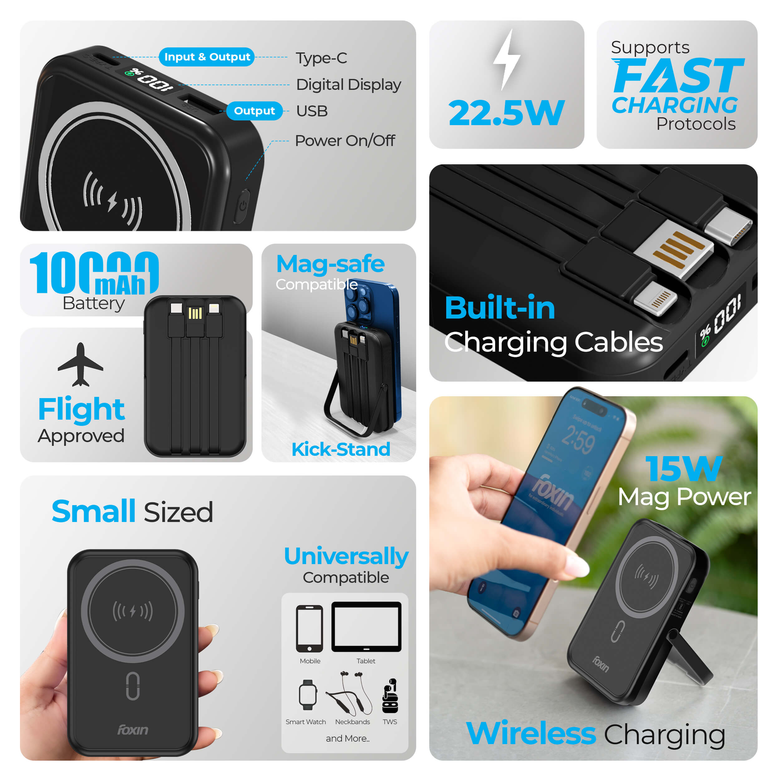 • 🔋 22.5W Fast Charging with 10000mAh Power: Foxin All-in-One Mag Pro delivers powerful 22.5W QC + PD wired charging and 15W wireless fast charging—ideal for on-the-go users needing reliable speed and performance.