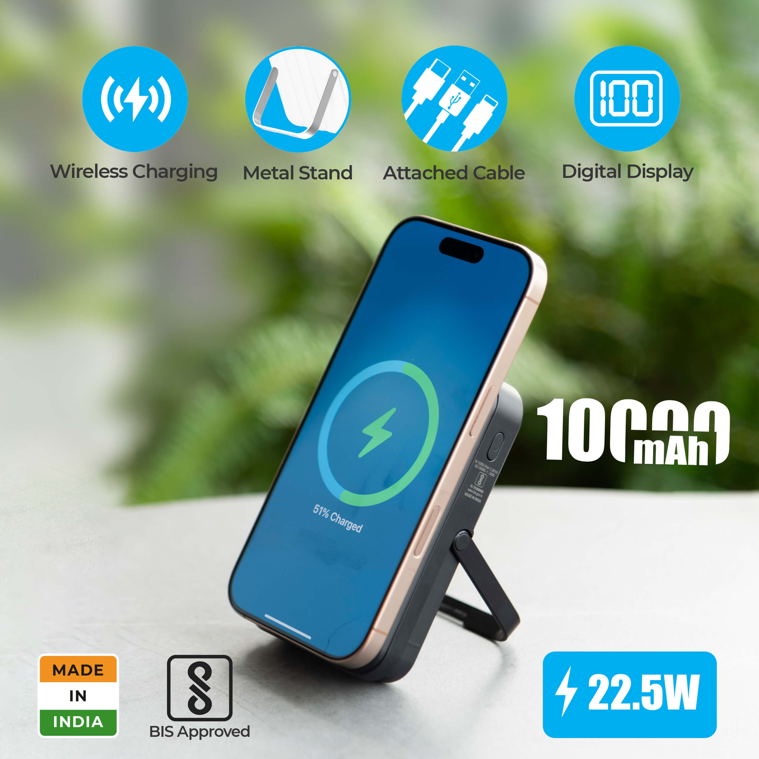 • 🖥️ Integrated Metallic Stand for Hands-Free Use: Prop your phone up with the sleek wireless power bank with stand to watch videos or attend video calls while it charges. Premium design built for convenience.